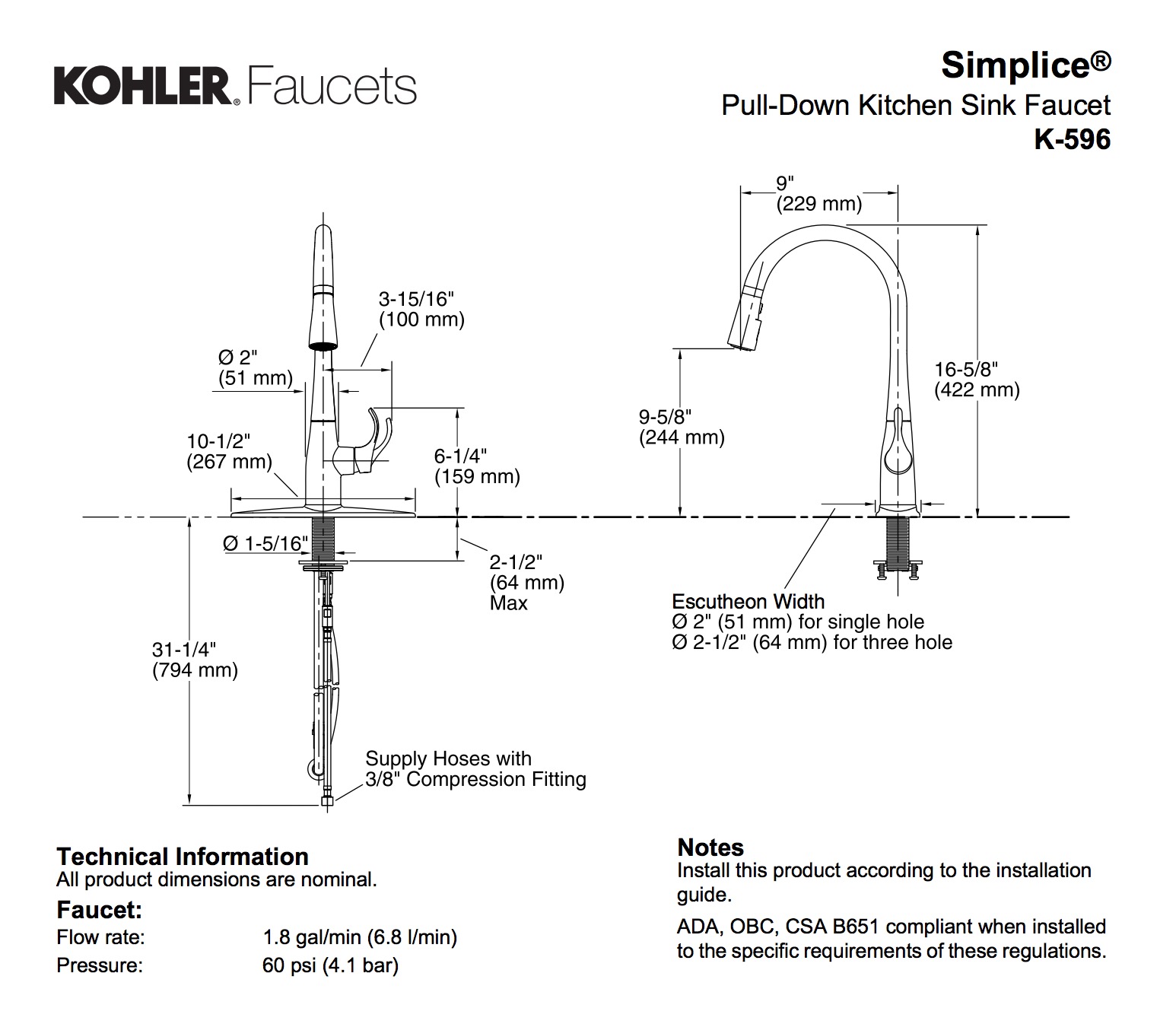 An innovative fit for a variety of kitchens and tasks, this Simplice kitchen faucet combines an elegant, universal design with exceptional ergonomics and functionality. The high-arch swing spout rotates 360 degrees, while the smoothly maneuvering sprayhead pulls down into the sink for up-close tasks, or out of the sink to fill pots. Sculpted buttons on the sprayhead ensure simple operation even with wet, soapy hands. Sweep™ spray creates a wide, forceful blade of water for superior cleaning. KOHLER's new docking system, DockNetik®, secures the pull-down sprayhead to the spout using magnetic force.