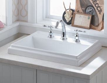 Top mount, also known as self rimming and drop-in sinks, are sinks that are placed into a cutout in the top of a counter or vanity. These types of sinks are set into the cutout and secured by a rim on the sink which overlaps the hole.