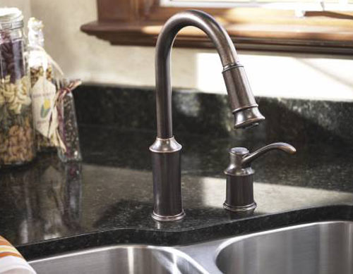Moen's Aberdeen collection features a classic style combined with surprisingly nimble functionality. The Aberdeen one-handle faucet features a high arc, pulldown spout with a one-of-a-kind pause button which enables you to conveniently interrupt the water flow when needed. Available in an oil rubbed bronze finish, chrome and classic stainless steel, the Aberdeen is sure to fit into any kitchen's decor.